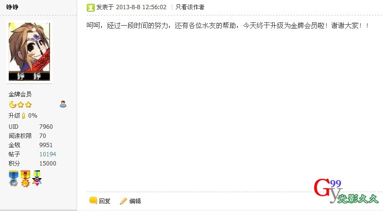 笨蛋的礼物 发表于 2013-8-13 16:42 恭喜铮铮成为金牌会员的~~~这几天都很忙·~现在才上来看到哦