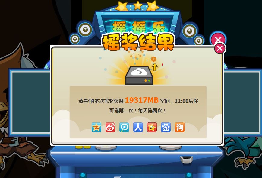 看来这个115网盘是等级越高,摇奖获得的空间越大啊,我昨晚摇了9.6G,我还以为115抽风了呢,因为前面每天摇的一次最多才190M啊
