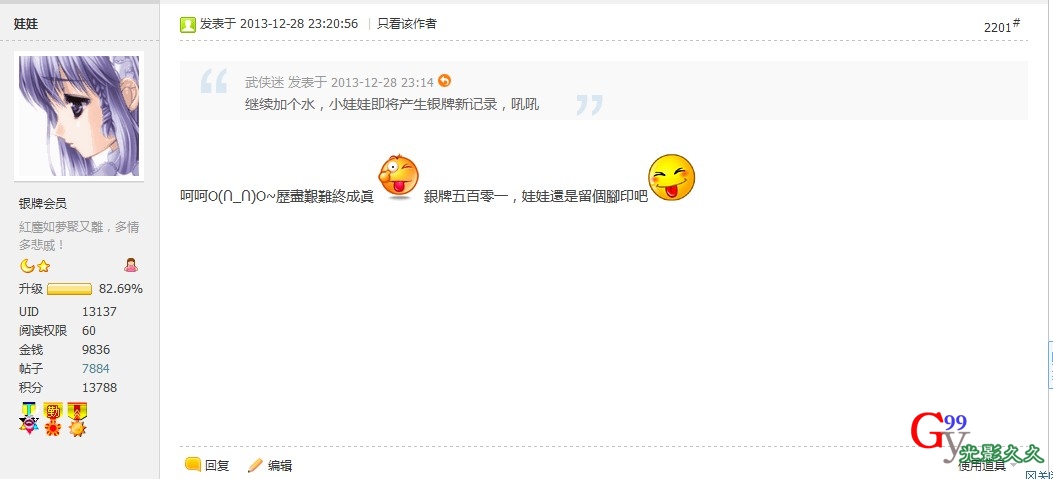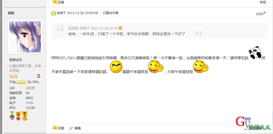 :二〇一三年十二月二十八日,娃娃來論壇的一個月有一天。原擬趁滿月之期破笨笨(笨蛋的禮物)那個銀牌會員記錄的,