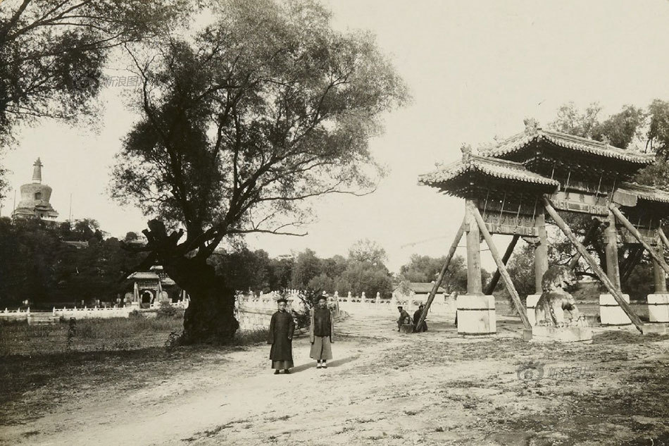 积翠牌坊前的合影,牌坊后面是永安桥,通往永安寺白塔。那时候,这里还不叫北海公园,而是叫北海,跟中海、南海合称西苑,是清宫帝后们常来游玩之所,皇家禁苑。