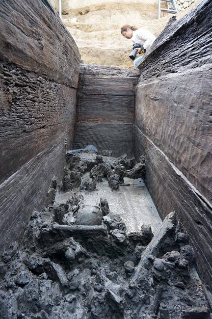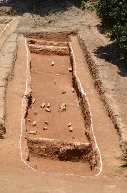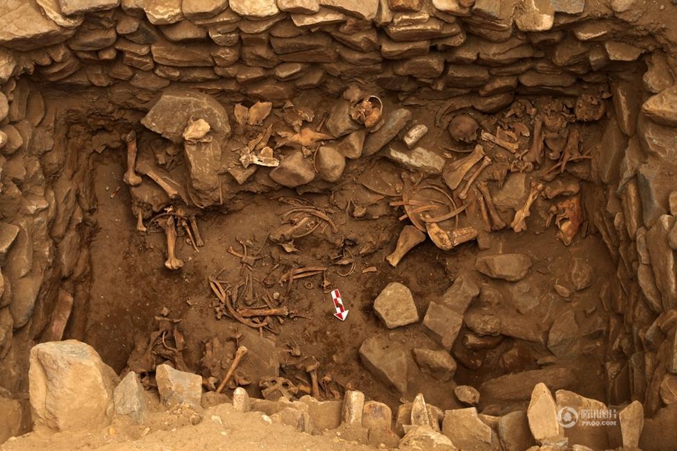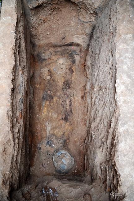 云南祥云大波那墓地的棺内人骨和随葬器物。