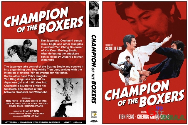 ![]() 拳王之王 (1972) The Champion of the Boxers 地區: 台灣 片種: 功夫/武術 Release Date: 10/12/1972 導演 陳烈品 編劇 蘇光勳 動作設計 黃飛龍 監製 陳烈品 演員 田鵬 (1) ... 田龍 張清清 ... 葉冰 陳鴻烈 ... 渡邊 易原 ... 岡平 田野(1) ... 葉清海 唐沁 張鵬 山茅 藍雲 吳東橋 蔡弘 ... 黑鷹 雲燕如 ... 雪子 / 芳子 小寧哥 周明清 黃飛龍 章少君 周俊 李逵 陳金海 出品公司 美麗華 攝影 陳喜樂 製片 陳景德 剪接 余燦峰 服裝 李其義 配樂 王居仁 道具 陳民生