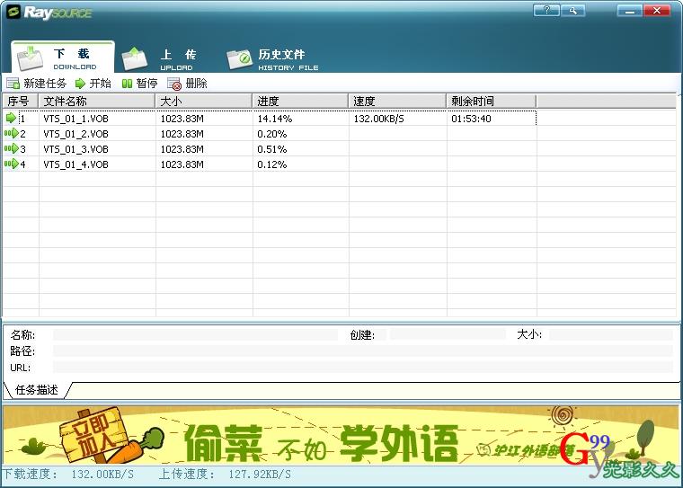 这个虽然是RAY网盘,但下载速度很快,我是网通1MB宽带,下载速度达到130KB/S,上图为证: