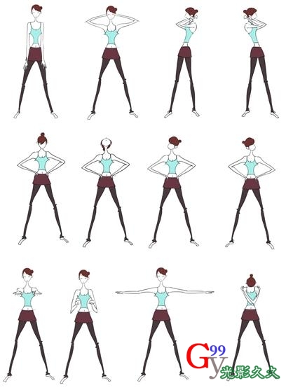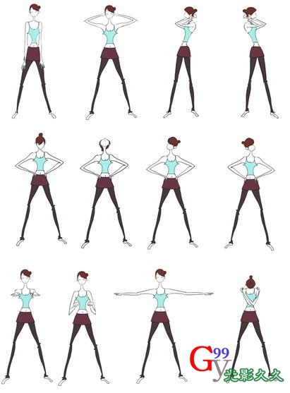 动作要领:站立位,一腿独立,一腿向后伸,同时双手上举做后伸动作,后压至最大后还原;然后换另一侧同样动作。身体向左侧方转动,同时双手上举做后伸动作,后伸至最大后还原;身体向右侧同样动作。